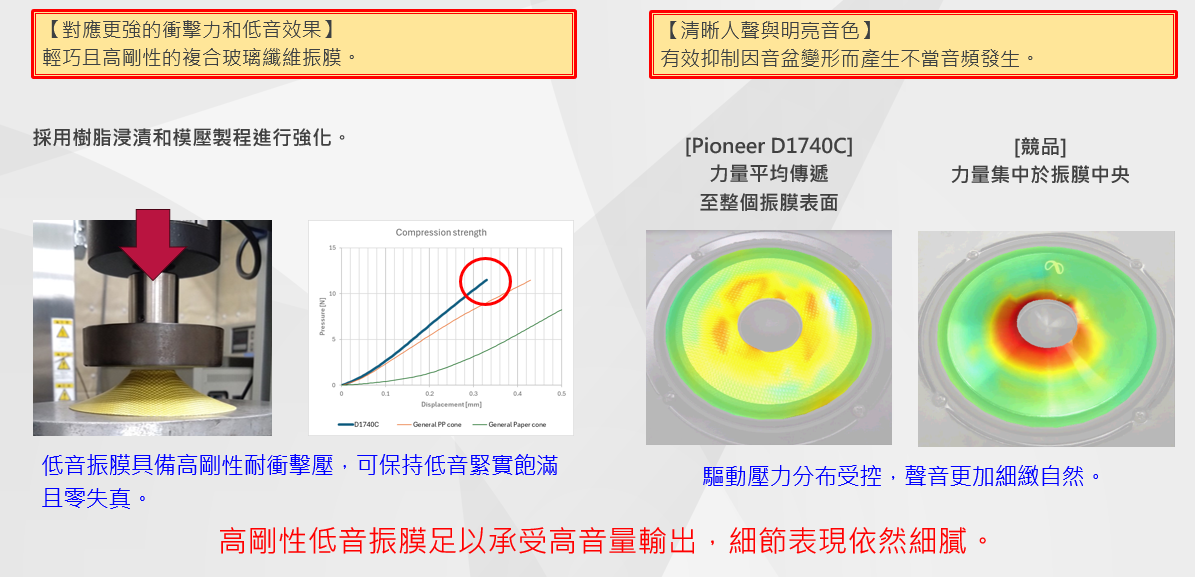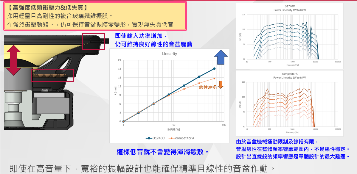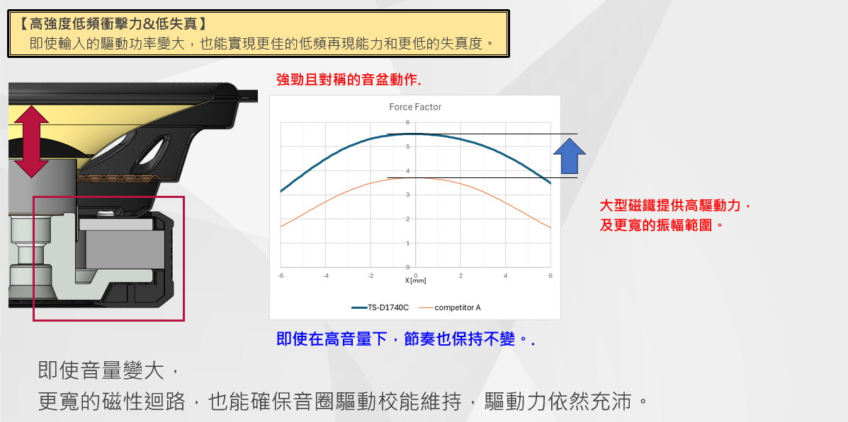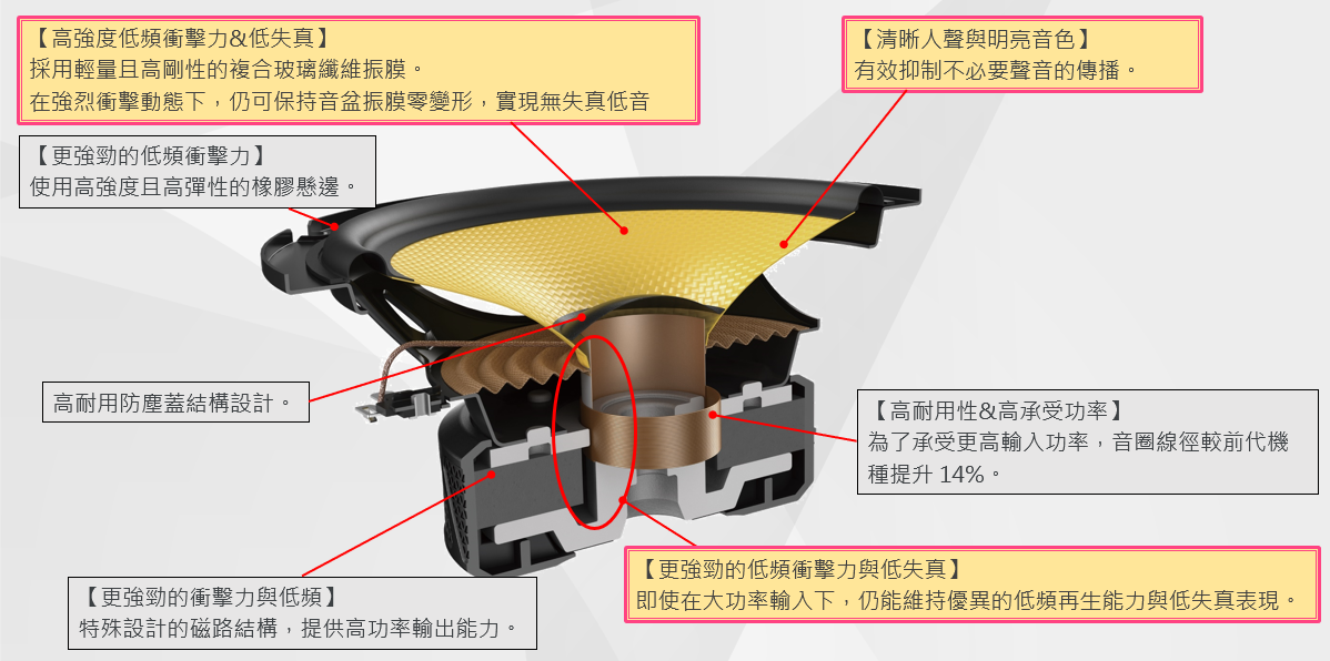・低頻:強烈衝擊感與厚實低音,同時維持超低失真